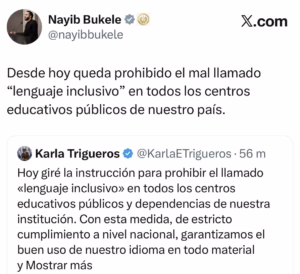 El Salvador. 03 de octubre del 2025.- El presidente de El Salvador, Nayib Bukele, anunció que prohíbe el uso del lenguaje inclusivo en todas las escuelas públicas del país. La medida fue difundida la noche del jueves a través de su cuenta de X.