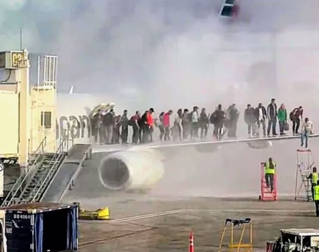 En los videos que se publicaron en redes sociales se aprecia cómo los pasajeros debieron evacuar el avión a través de los toboganes con los que cuentan las aeronaves para este tipo de situaciones.