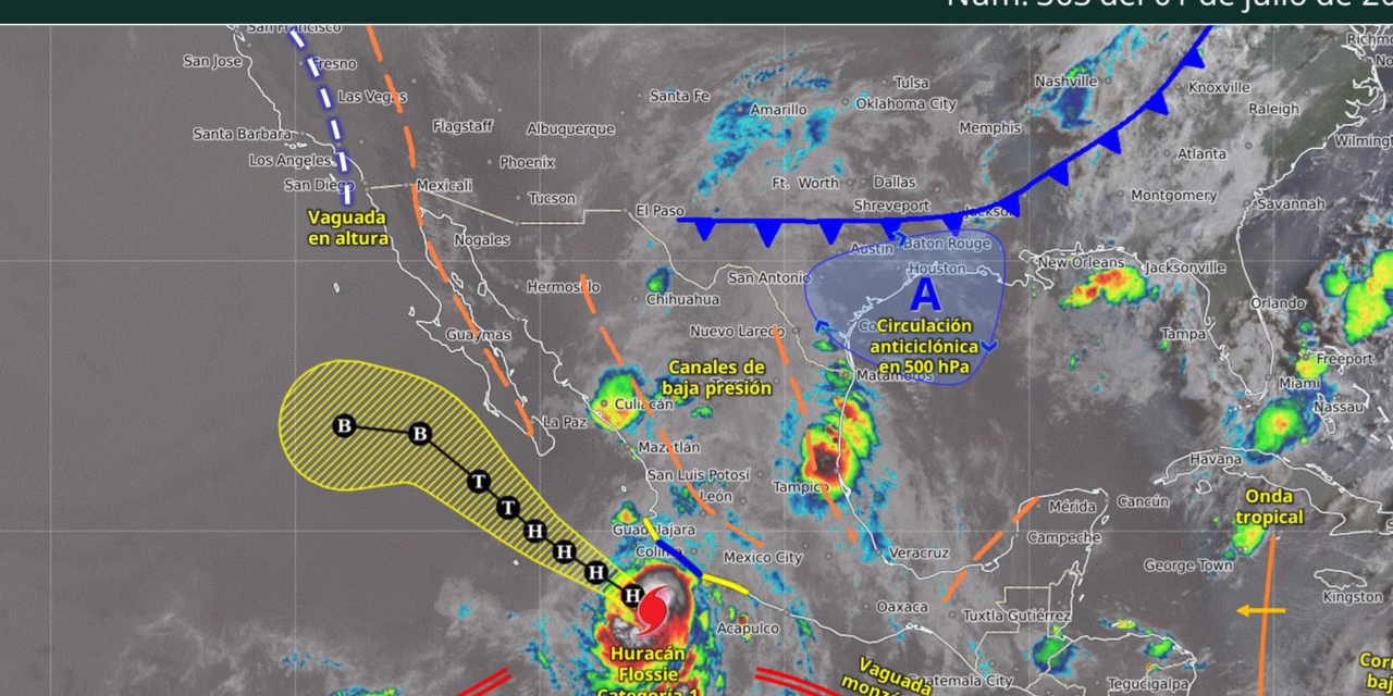 México. 01 de julio del 2025.-Este día, Flossie se intensificará a huracán de categoría 2 en la escala Saffir-Simpson, se desplazará paralelo a las costas de Michoacán, Colima y Jalisco; su extensa circulación y bandas nubosas ocasionarán lluvias intensas a puntuales torrenciales en los estados mencionados, además de Sinaloa, Nayarit y Guerrero; asimismo, vientos muy fuertes a intensos y oleaje elevado en Michoacán, Colima y Jalisco; así como en la costa occidental de Guerrero (durante la mañana). Simultáneamente, canales de baja presión sobre el norte, centro, noreste y oriente de la República Mexicana, en interacción con los desprendimientos nubosos del huracán Flossie en el Pacífico Mexicano, con una vaguada en altura e inestabilidad atmosférica, propiciarán chubascos y lluvias fuertes a puntuales muy fuertes en dichas regiones.