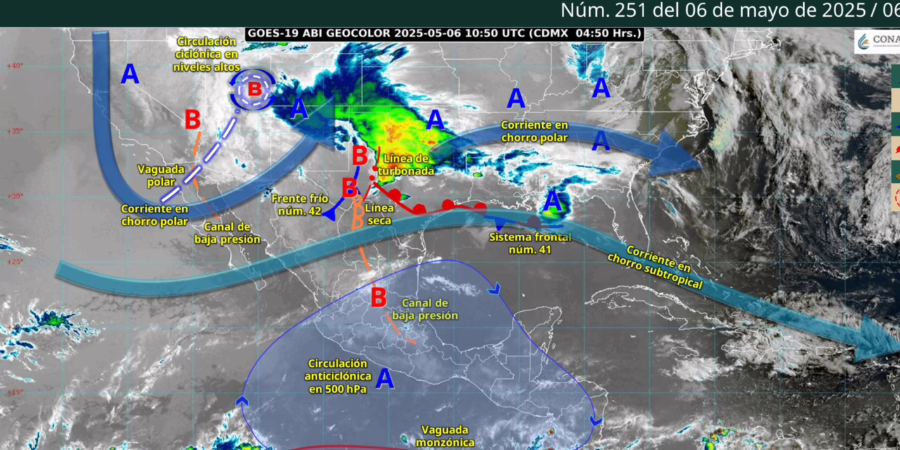 México. 06 de mayo del 2025.-Para este día, el frente frío núm. 42 en interacción con una vaguada polar, las corrientes en chorro polar y subtropical y un canal de baja presión sobre el noreste mexicano, producirán lluvias y chubascos en dicha región con lluvias puntuales fuertes en Coahuila, así como vientos fuertes a muy fuertes con tolvaneras en el norte del territorio nacional, pronosticándose rachas de viento de 70 a 90 km/h en Sonora, Chihuahua y Durango; así como posible caída de nieve o aguanieve en las sierras de Baja California y el norte de Sonora, durante la mañana. Asimismo, se prevén rachas de viento de 60 a 80 km/h y posible formación de torbellinos en Coahuila (noreste), Nuevo León (norte) y Tamaulipas (noroeste).