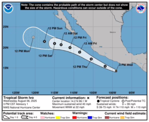 México. 06 de agosto del 2025.-Este miércoles 6 de agosto de 2025 se formó un nuevo fenómeno meteorológico frente a las costas de México: la tormenta tropical Ivo, el noveno ciclón tropical que se forma en la actual temporada en el océano Pacífico.