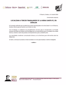 México. 08 de abril del 2026.-El Comando Unificado que coordina las acciones de búsqueda en la mina Santa Fe, en El Rosario, Sinaloa, informa que se localizó a un minero sin vida.