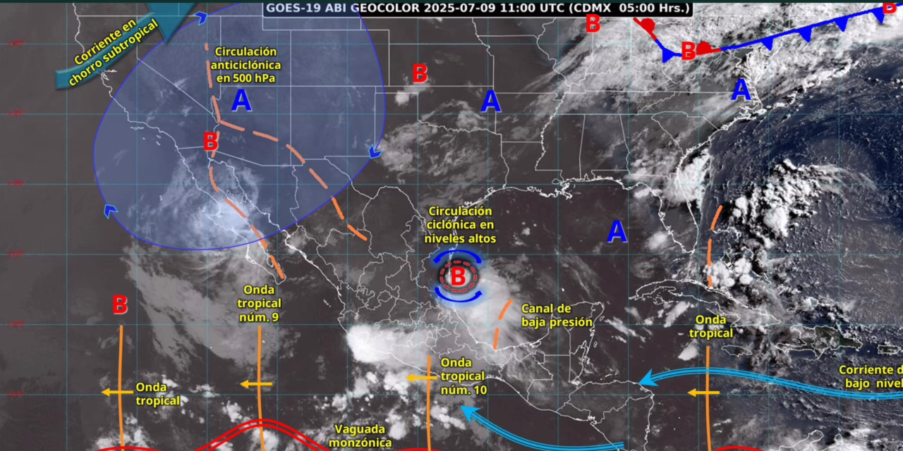 México. 09 de julio del 2025.-Este día, el monzón mexicano sobre el noroeste del territorio nacional, ocasionará chubascos y lluvias puntuales fuertes en Baja California Sur, Sonora y Chihuahua, así como lluvias puntuales intensas en Durango (oeste y suroeste), Sinaloa (centro y sur) y Nayarit (norte). Simultáneamente, canales de baja presión sobre el norte, noreste, centro y oriente del país, en combinación con una circulación ciclónica en niveles altos de la atmósfera; aunado a inestabilidad atmosférica y el desplazamiento de la onda tropical núm. 10 sobre el sur y occidente de México, propiciarán chubascos y lluvias fuertes a puntuales muy fuertes en estados del norte, noreste, oriente, centro, occidente y sur de la República Mexicana; con lluvias puntuales intensas en Jalisco (occidente).