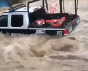 Querétaro. 09 de octubre del 2025.-La fuerza del agua sorprendió a Jalpan de Serra en el estado de Querétaro, una patrulla fue arrastrada por la corriente mientras apoyaba a la comunidad.