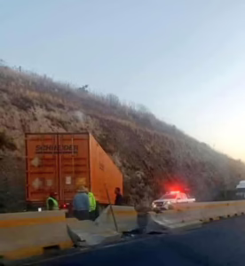 En el lugar labora personal de CAPUFE, bomberos y cuerpos de emergencia en el retiro del tráiler de color rojo con caja naranja, que está atravesado en los dos carriles de circulación y literalmente incrustado en un talud.