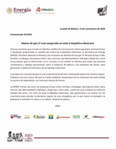 La SENER, Pemex, así como las empresas Grupo Uribe, SoniGas, Combugas, Gas Express Nieto, Gas y Servicio, Gas Metropolitano, Hidrogas y Regio Gas, entre otras, confirman que el abasto en todos los estados del centro, así como en toda la República Mexicana, está garantizado y se cuenta con los inventarios para atender la demanda regular de este energético, por lo que hacen un llamado a la población a mantener la calma y no realizar compras de pánico.
