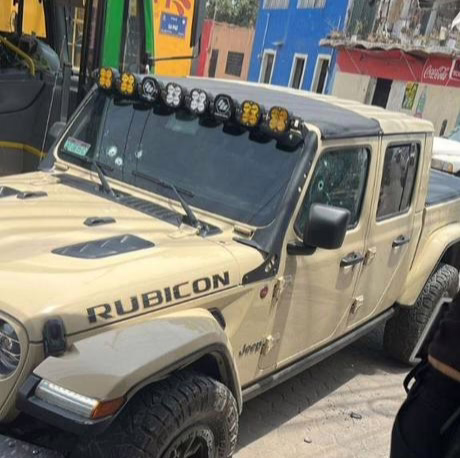 En redes sociales se difundieron imágenes y videos de una camioneta Jeep Rubicon color beige, presuntamente propiedad del influencer, que quedó detenida a media calle. En el material se observan múltiples impactos de bala en los cristales y puertas del vehículo.