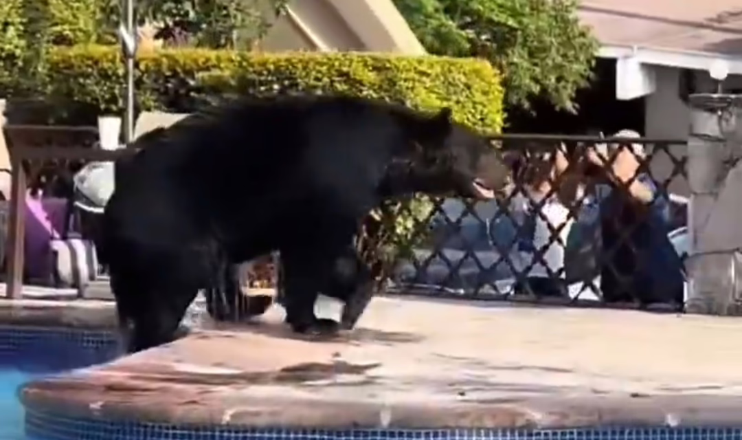 Nuevo León. 15 de julio del 2025.-Un oso fue captado dándose un chapuzón en una alberca en la zona de San Pedro en Monterrey este fin de semana.