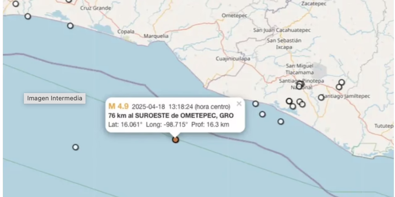 El Servicio Sismológico Nacional (SSN) informó que el movimiento ocurrió a las 13:18 horas, con una magnitud de 4.9 y epicentro a 63 kilómetros al suroeste de Ometepec, Guerrero.