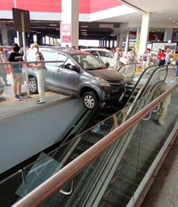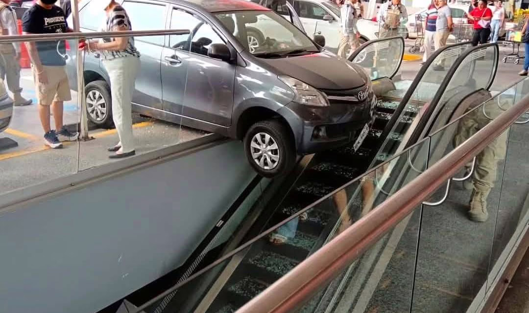 Monterrey, Nuevo León. 19 de mayo del 2025.-El día de ayer domingo, una mujer de la tercera edad estuvo a punto de caer por las escaleras eléctricas de la plaza Urban Village, al sur de Monterrey, luego de confundir los pedales de su camioneta al intentar salir del estacionamiento.