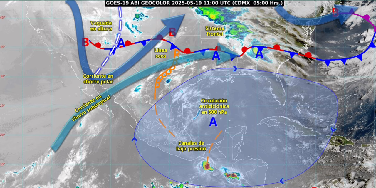 Por su parte, canales de baja presión sobre el centro y sureste de la República Mexicana, en combinación con inestabilidad atmosférica y con el ingreso de humedad proveniente del océano Pacífico, golfo de México y mar Caribe, generarán lluvias puntuales fuertes en Chiapas, Hidalgo, Puebla, Tlaxcala y Estado de México, así como lluvias con intervalos de chubascos en centro, occidente y sureste de México, todas acompañadas con descargas eléctricas y posible caída de granizo. Finalmente, una circulación anticiclónica en niveles medios de la atmósfera, mantendrá el ambiente caluroso a muy caluroso sobre el territorio mexicano, prevaleciendo la onda de calor en Sinaloa (centro y sur), Nayarit (noreste), Jalisco, Colima (este), Michoacán, Guerrero, Oaxaca, Chiapas (oeste), Durango (noreste y sur), Coahuila (suroeste, centro y este), Nuevo León (oeste, suroeste, sur y este), Tamaulipas (oeste y suroeste), San Luis Potosí (norte, centro y sur), Zacatecas (noroeste, noreste, centro y sur), Aguascalientes, Guanajuato (norte, noreste, centro y sur), Querétaro (norte, centro y sureste), Hidalgo (noroeste, centro y suroeste), Tlaxcala (noreste), Estado de México (norte y suroeste), Ciudad de México, Morelos, Puebla (norte y suroeste), Veracruz (centro), Campeche (norte) y Yucatán (suroeste).