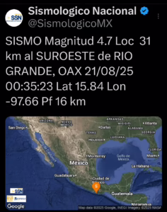 Oaxaca. 21 de agosto del 2025.- Durante la madrugada de este jueves 21 de agosto se registró un sismo de magnitud 4.7 al suroeste de Río Grande, Oaxaca.