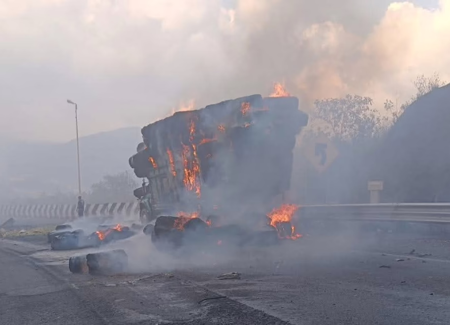 Un tráiler se impactó con un camión que transportaba pacas de paja, lo que provocó un incendio que consumió ambas unidades.
