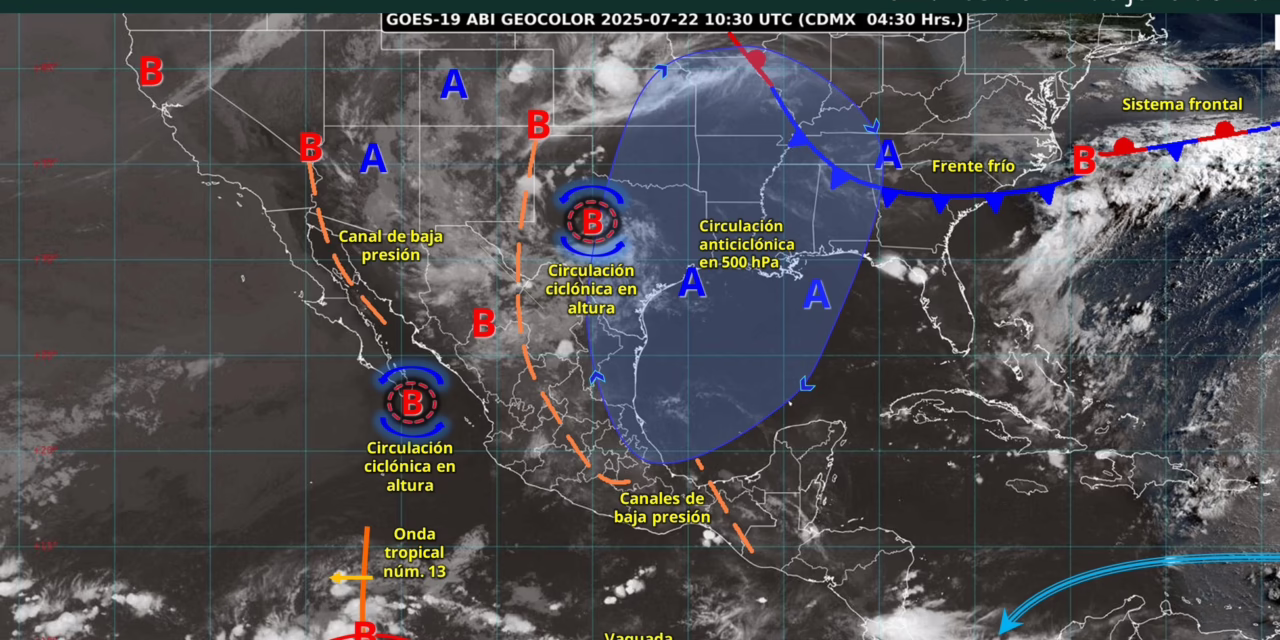 México. 22 de julio del 2025.-Para hoy, el monzón mexicano sobre el noroeste del país en interacción con una circulación ciclónica en altura sobre el sur del golfo de California, ocasionarán lluvias puntuales muy fuertes en Durango y Chihuahua, puntuales fuertes en Nayarit y Sinaloa, intervalos de chubascos en Sonora y lluvias aisladas en zonas de Baja California Sur. Un canal de baja presión sobre la Mesa del Norte y la Mesa Central, en combinación con inestabilidad atmosférica en el noreste de México y con ingreso de aire húmedo del golfo de México, producirán lluvias puntuales muy fuertes en Coahuila; puntuales fuertes en Puebla, Guerrero, Michoacán, Colima, Jalisco y Zacatecas; intervalos de chubascos en Tlaxcala, Morelos, Estado de México, Guanajuato, Aguascalientes, San Luis Potosí y Nuevo León; y lluvias aisladas en la Ciudad de México y zonas de Querétaro, Hidalgo y Tamaulipas. A su vez, otro canal de baja presión sobre el sureste mexicano y el ingreso de aire húmedo proveniente del mar Caribe sobre la península de Yucatán, originarán lluvias puntuales muy fuertes en Tabasco, Veracruz, Chiapas y Oaxaca, así como lluvias puntuales fuertes en Quintana Roo, Yucatán y Campeche. Finalmente, continuará el ambiente caluroso a muy caluroso por la tarde sobre entidades del norte del territorio nacional, estados del Pacífico Mexicano y la península de Yucatán.