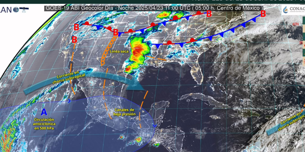 México. 23 de abril del 2025.-Para hoy, la línea seca permanecerá sobre el norte de Chihuahua y Coahuila, interaccionará con la corriente en chorro subtropical, con inestabilidad en niveles altos de la atmósfera y con el ingreso de humedad del golfo de México, propiciarán chubascos y lluvias puntuales fuertes con posibles descargas eléctricas y caída de granizo en Coahuila, Nuevo León y Tamaulipas, así como rachas de viento de 50 a 70 km/h y posible formación de torbellinos o tornados en Chihuahua (noreste) y Coahuila (norte).