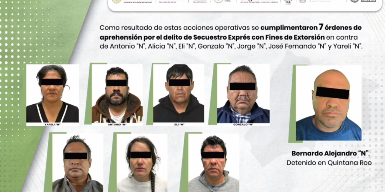 En conferencia de prensa, el secretario indicó que esta operación dirigida a desmantelar las redes criminales de extorsión en el estado contó con el despliegue de 63 células operativas con dos mil 866 elementos del Gabinete de Seguridad y dependencias estatales y logró la captura de Antonio “N”, Alicia “N”, Ali “N”, Gonzalo “N”, Jorge “N”, José Fernando “N” y Yareli “N”; además de Bernardo Alejandro “N”, quien fue aprehendido en Quintana Roo.