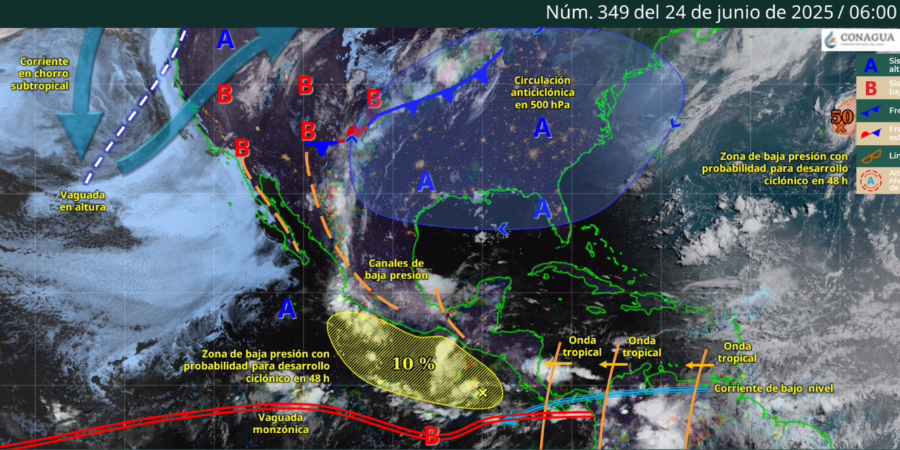 El ingreso de aire húmedo del océano Pacífico y la proximidad de una zona de baja presión con probabilidad para desarrollo ciclónico situada al sur de Guatemala, aunados a la vaguada monzónica frente a costas del Pacífico sur mexicano, generarán lluvias puntuales intensas en Oaxaca, Michoacán, Colima y Jalisco; y puntuales muy fuertes en Guerrero.