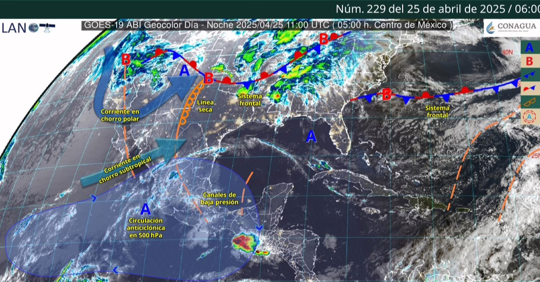 México. 25 de abril del 2025.-Para hoy, la línea seca se extenderá sobre el norte de Chihuahua y Coahuila, en combinación con la entrada de humedad del golfo de México e inestabilidad en altura, mantendrán lluvias e intervalos de chubascos acompañados con descargas eléctricas y rachas fuertes de viento en Coahuila, Nuevo León, Tamaulipas y San Luis Potosí.