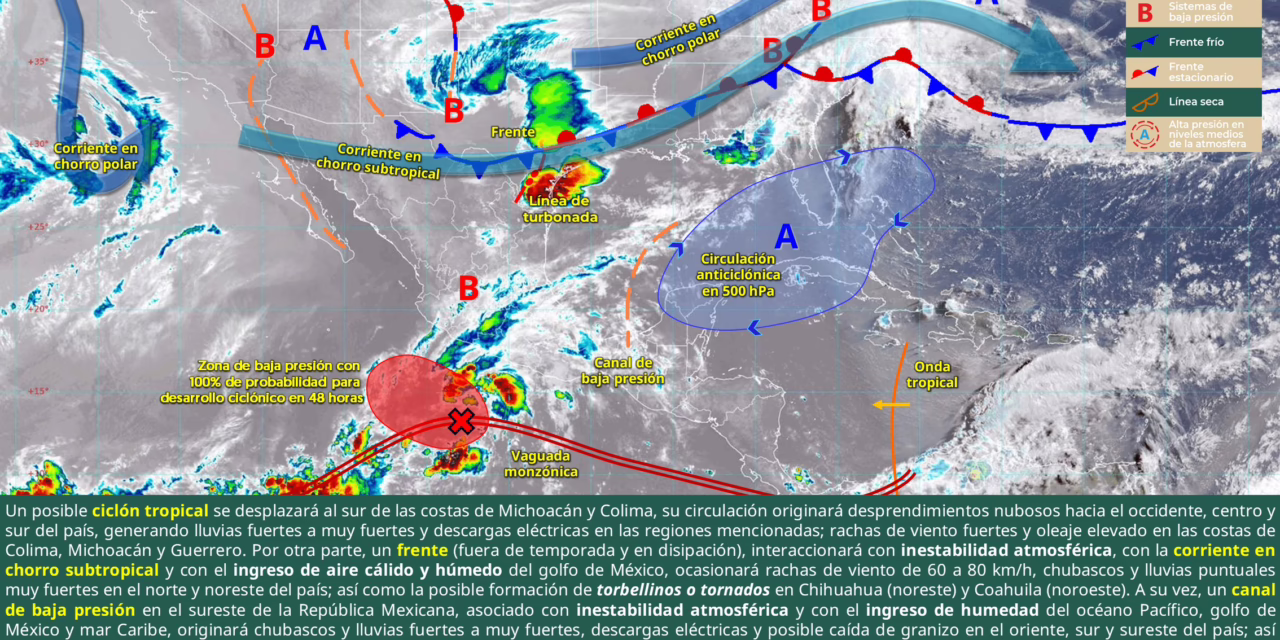 México. 28 de mayo del 2025.-Durante este día, un posible ciclón tropical se desplazará al sur de las costas de Michoacán y Colima, su circulación originará desprendimientos nubosos hacia el occidente, centro y sur del país, generando lluvias fuertes a muy fuertes y descargas eléctricas en las regiones mencionadas; rachas de viento fuertes y oleaje elevado en las costas de Colima, Michoacán y Guerrero.