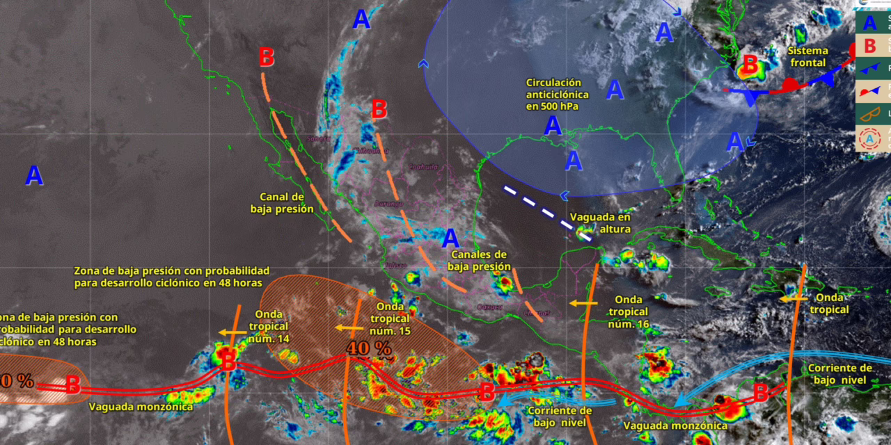 A su vez, la onda tropical núm. 16 que recorrerá la península de Yucatán y el ingreso de aire húmedo del mar Caribe en interacción con otro canal de baja presión sobre el sur del golfo de México y sureste del país, ocasionarán lluvias puntuales intensas en Oaxaca y sur de Veracruz; puntuales muy fuertes en Quintana Roo, Yucatán, Campeche y Chiapas; y puntuales fuertes en Tabasco.