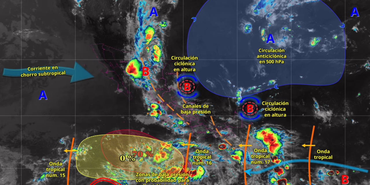 Por otra parte, canales de baja presión sobre el interior del territorio nacional, en interacción con una circulación ciclónica en altura sobre el noreste del país e inestabilidad atmosférica, originarán lluvias puntuales muy fuertes en Jalisco, Colima, Michoacán y Puebla; intervalos de chubascos en Tamaulipas, San Luis Potosí, Querétaro, Hidalgo, Tlaxcala, Estado de México, Ciudad de México y Morelos; además de lluvias aisladas en Coahuila, Nuevo León, Zacatecas, Aguascalientes y Guanajuato. Simultáneamente, la onda tropical núm. 16 se desplazará sobre Guerrero, en donde se prevén lluvias puntuales muy fuertes; mientras que un canal de baja presión sobre el sureste mexicano interactuará con la onda tropical núm. 17, que recorrerá la península de Yucatán y con una circulación ciclónica en altura sobre dicha península, condiciones que generarán lluvias puntuales intensas en Veracruz (sur), Oaxaca (norte y este) y Chiapas (este y sur); así como lluvias fuertes a muy fuertes en Tabasco, Campeche, Yucatán y Quintana Roo.