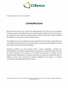 México. 30 de junio del 2025.-Desde este lunes por la tarde, las tarjetas internacionales de CIBanco quedaron congeladas por decisión de la empresa Visa.