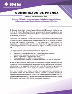 México. 31 de marzo del 2026.-El Instituto Nacional Electoral (INE) ha informado que un total de cinco organizaciones han formalizado su solicitud para convertirse en partidos políticos nacionales.