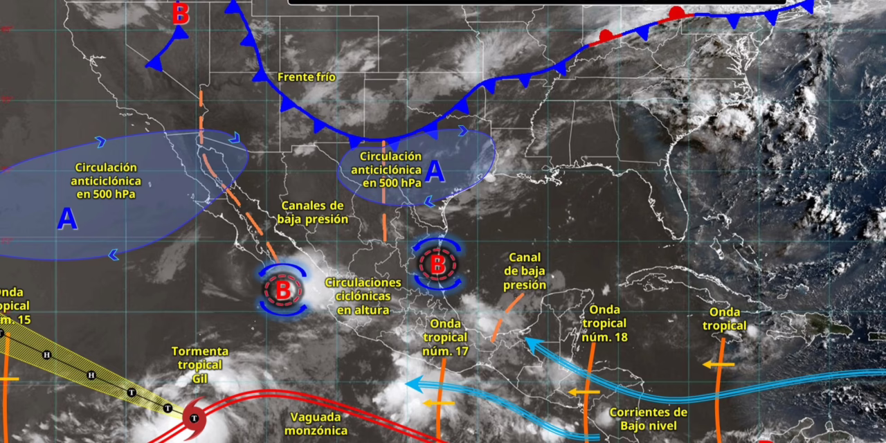 Asimismo, continuará el ambiente caluroso a muy caluroso sobre entidades del norte del país, estados del litoral del Pacífico, litoral del golfo de México y la península de Yucatán, con temperaturas superiores a 45 °C en Baja California y Sonora; también se mantendrá la onda de calor en zonas de Baja California, Baja California Sur, Sonora, Sinaloa, Colima y Michoacán. Finalmente, esta madrugada se formó la tormenta tropical Gil en el océano Pacífico, sin afectación para el territorio nacional.