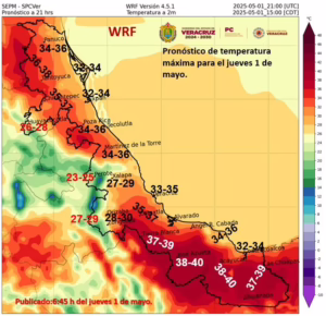 Xalapa, Ver., jueves 1 de mayo de 2025.-En las próximas 24 horas se mantendrá el ambiente caluroso al mediodía y primeras horas de la tarde, la probabilidad de lluvia acompañadas por tormentas (actividad eléctrica, ráfagas de viento y posible caída de granizo) aumentan especialmente en regiones de montaña del norte y centro por la tarde a primeras horas de la noche.