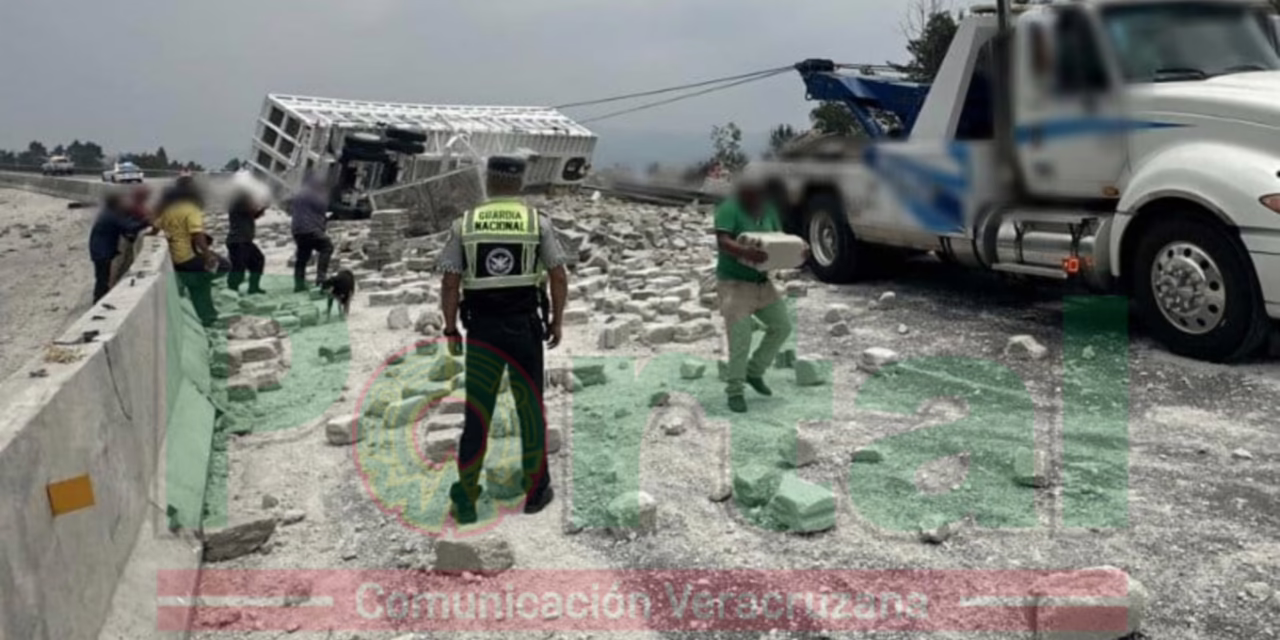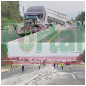 El impacto provocó que uno de los remolques del vehículo pesado volcara y quedara atravesado en los carriles con dirección a Perote, bloqueando el tránsito en ese sentido.