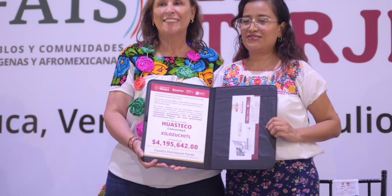 Tantoyuca, Ver., jueves 31 de julio de 2025.- En un acto de reivindicación histórica y justicia social, la gobernadora Rocío Nahle García y la secretaria de Bienestar del Gobierno de México, Ariadna Montiel Reyes, entregaron 183 tarjetas del Fondo de Aportaciones para la Infraestructura Social para Pueblos y Comunidades Indígenas y Afromexicanas (FAISPIAM) a igual número de comités comunitarios integrados por pobladores tenek de Tantoyuca.