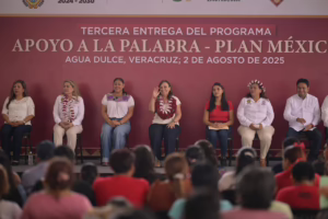 Agua Dulce, Ver., sábado 02 de agosto de 2025.- “Este es uno de los programas más importantes de mi gobierno, porque es directo, transparente y pensado para quienes se esfuerzan todos los días por salir adelante”, refrendó la gobernadora Rocío Nahle García en la tercera entrega del programa Apoyo a la Palabra–Plan México, donde fueron beneficiadas casi mil personas.