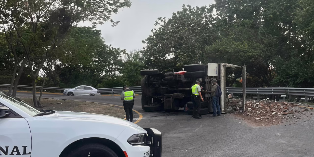 Un camión tipo volteo sufrió una volcadura, generando una interrupción momentánea en el tráfico vehicular.