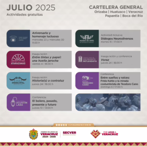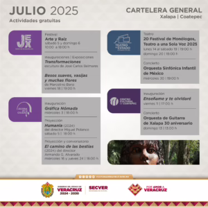 Xalapa, Ver., miércoles 02 de julio de 2025.- La Secretaría de Cultura de Veracruz (SECVER) presenta una nutrida cartelera de actividades culturales en sus recintos e invita al público en general a participar en ellas durante el mes de julio.