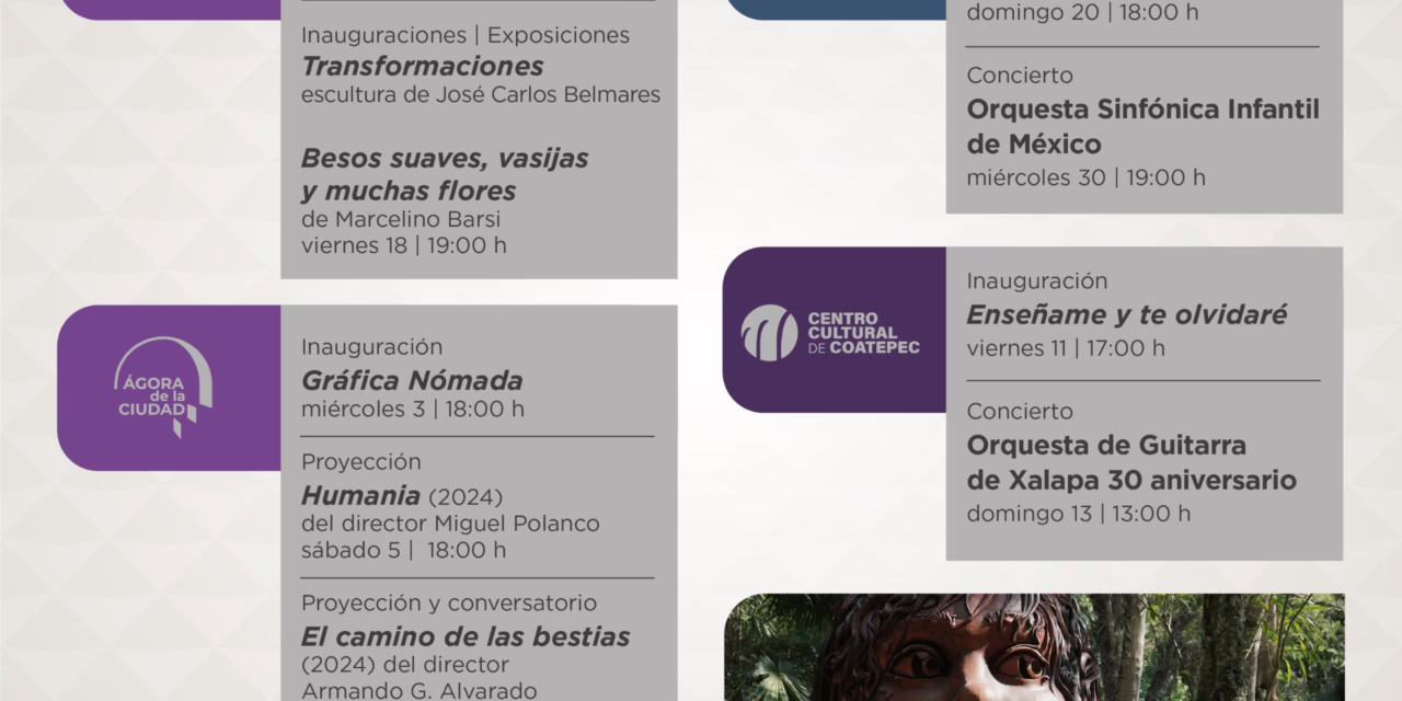 El Centro Cultural de Coatepec inaugurará la exposición Enséñame y te olvidaré, pintura de Esaú P. Durán, el viernes 11 a las 17:00 horas. El domingo 13, a las 13:00 horas, se realizará el Concierto de la Orquesta de Guitarras de Xalapa con motivo de su 30 aniversario. Consulta la oferta que ofrece este espacio cultural en @CentroCulturalCoatepec.