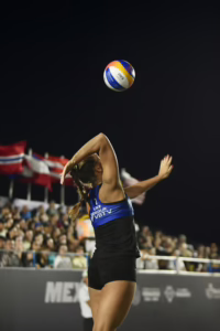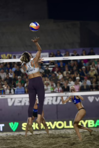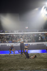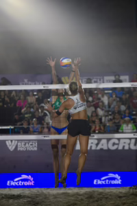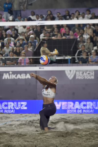 Boca del Río, Ver.,- Con la asistencia de más de dos mil personas en la cancha principal instalada junto al Foro Boca, el Tour Mundial de Voleibol de Playa Challenge Veracruz vivió este viernes una jornada intensa con los partidos de clasificación femenil rumbo a los octavos de final.