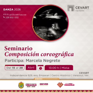 Asimismo, del 15 al 28 de abril, a las 17:00 horas la coreógrafa Marcela Negrete ofrecerá el Seminario Composición coreográfica en modalidad mixta, dirigido a profundizar en los principios estructurales y metodológicos de la creación coreográfica.