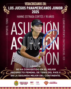 Hanne Estrada Cortés, de Coatzacoalcos, es una destacada tenista de 16 años con trayectoria internacional. Ha participado en el Roland Garros Junior Series y en torneos de la ITF, colocándose entre las 50 mejores del mundo en la categoría juvenil. Su competencia será del 11 al 16 de agosto.