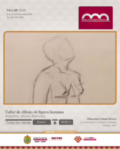 Este viernes 9 inicia el Taller de dibujo de figura humana, impartido por Ulises Ramírez, dirigido a jóvenes de 16 años en adelante y a personas adultas interesadas en profundizar en el estudio del cuerpo humano a partir de la observación, la proporción y el trazo. Las sesiones se llevarán a cabo todos los viernes de enero a las 16:00 horas. Mayor información y registro, en el siguiente sitio: https://forms.gle/t4j4zgjHvcBUR2rCA.