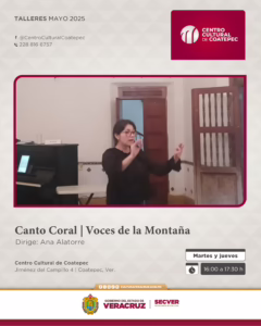 El taller Canto Coral Voces de la Montaña, dirigido por Ana Alatorre, se lleva a cabo los martes y jueves de 16:00 a 17:30 horas. Es una actividad que promueve el trabajo en equipo, la expresión vocal y el gusto por el canto colectivo.