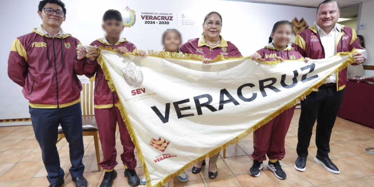 Xalapa, Ver., martes 10 de junio de 2025.- La Secretaría de Educación de Veracruz entregó uniformes deportivos y el banderín oficial a estudiantes que participarán en el Torneo Nacional de Fútbol Escolar 5 vs 5, en Toluca, Estado de México, convocado por la Federación Mexicana de Fútbol.
