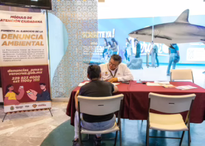 Ubicada en la Plaza Acuario, en Veracruz, personal de la Procuraduría promovió activamente, de 9:00 a 12:00 horas, la participación ciudadana y el conocimiento sobre los mecanismos de denuncia ante posibles afectaciones al medio ambiente, a través del diálogo, la entrega de materiales informativos y la resolución de dudas.