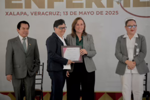 Durante la ceremonia, la titular del Ejecutivo, Rocío Nahle García, entregó seis distinciones por trayectoria y compromiso, así como la Medalla al Mérito y Condecoración Enfermera y Partera Teresa Rodríguez Alonso 2025 a Claudia Hernández Landaverde por su destacada labor en el Hospital del ISSSTE en Poza Rica.