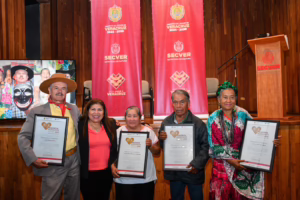Recibieron reconocimientos Ciria Alicia Macario Xochicale, partera tradicional y dadora de vida; Anatolio Cruz del Ángel, por su aporte al patrimonio cultural comunitario; Lino Mora Rivera, por la creación de máscaras tradicionales, y Felipe Crescencio Cruz, por la labor artística con la danza de los matachines.