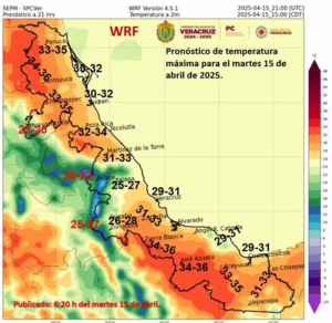 Xalapa, Ver., 15 de abril de 2025.-En las próximas 24 horas aumentan las condiciones para lloviznas y lluvias aisladas y ligeras en el estado de Veracruz, persistiendo ambiente relativamente caluroso a caluroso al mediodía y fresco a frío por la noche a madrugada con probabilidad de heladas ligeras en partes altas de zonas serranas de nuestro estado.