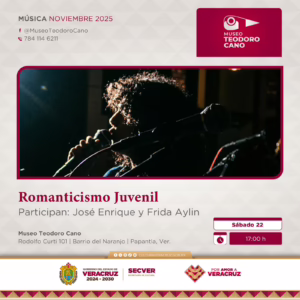 El sábado 22 de noviembre, a las 17:00 horas, el público podrá disfrutar de la presentación artística Romanticismo juvenil. Este evento promueve el talento artístico local y brindar un espacio para que las nuevas generaciones compartan su voz y emoción con el público. Será un recorrido musical de canciones que evocan el amor, la juventud y la sensibilidad artística, interpretadas por voces frescas y prometedoras de jóvenes talentos del municipio de Papantla de Olarte.
