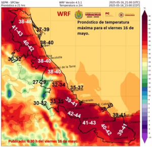 Xalapa, Ver., viernes 16 de mayo de 2025.-La ola de calor en el estado de Veracruz puede persistir por lo menos hasta el próximo miércoles; asimismo, se mantendrá la Surada moderada a fuertes en sectores de la zona sur, mientras en la costa el viento dominante será del Noreste, Este y Sureste de 20 a 35 km/h con algunas rachas. Se recomienda mantenerse hidratado, no exponerse a periodos prolongados al sol y evitar acciones que originen incendios forestales, de pastizales y de basureros. Consulte *Aviso Especial* por *ola de calor*.