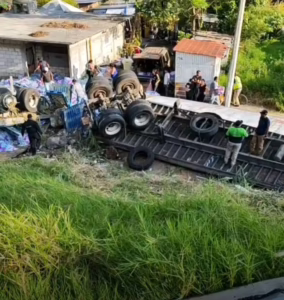 El percance ocurrió en uno de los tramos con mayor afluencia vehicular, cuando el tractocamión, propiedad de la empresa Transmer, perdió el control al tomar una curva pronunciada, abandonó la carpeta asfáltica y quedó volcado a pocos metros de un área habitacional, lo que provocó alarma entre vecinos y automovilistas.