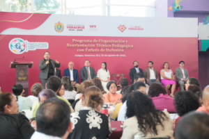 Finalmente, resaltó el compromiso de la gobernadora Rocío Nahle García al garantizar materiales y apoyos inmediatos: entrega de guías impresas para los Consejos Técnicos Escolares, mobiliario, trabajos de mantenimiento en planteles, así como la reconstrucción de más de 130 escuelas.
