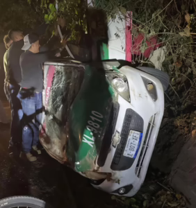 El incidente ocurrió alrededor de las 21:00 horas, cuando el conductor del taxi con número económico XL-9810 perdió el control de la unidad, lo que provocó que el vehículo terminara con las llantas hacia arriba sobre la cinta asfáltica.